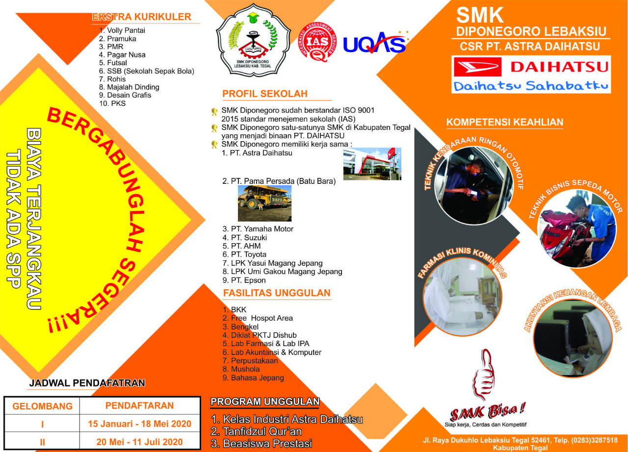 “Kami stand by di sekretariat pendaftaran setiap hari dari pukul 07 pagi hingga jam 13 tengah hari. Gratis tidak ada uang pendaftaran dan (Gratis) tidak ada uang SPP. SMK Diponegoro Lebaksiu Sekolah Ramah Anak”, kata Rudi Hartono selaku Panitia Penerimaan Peserta Didik Baru.