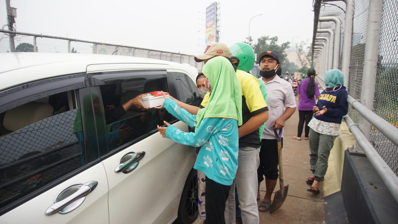 Nia tampak semangat dan cekatan membagikan satu persatu makanan kepada warga terdampak pandemi Covid-19, mulai supir angkot, pengemudi ojol, pedagang asongan dan pemulung.