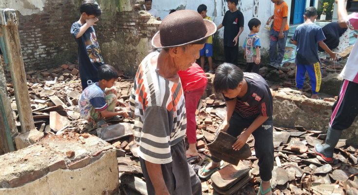Keesokan harinya, beberapa warga tua muda bahkan anak-anak melakukan kerigan membersihkan puing-puing reruntuhan rumah yang terkena bencana angin puting beliung.   (Mardja)