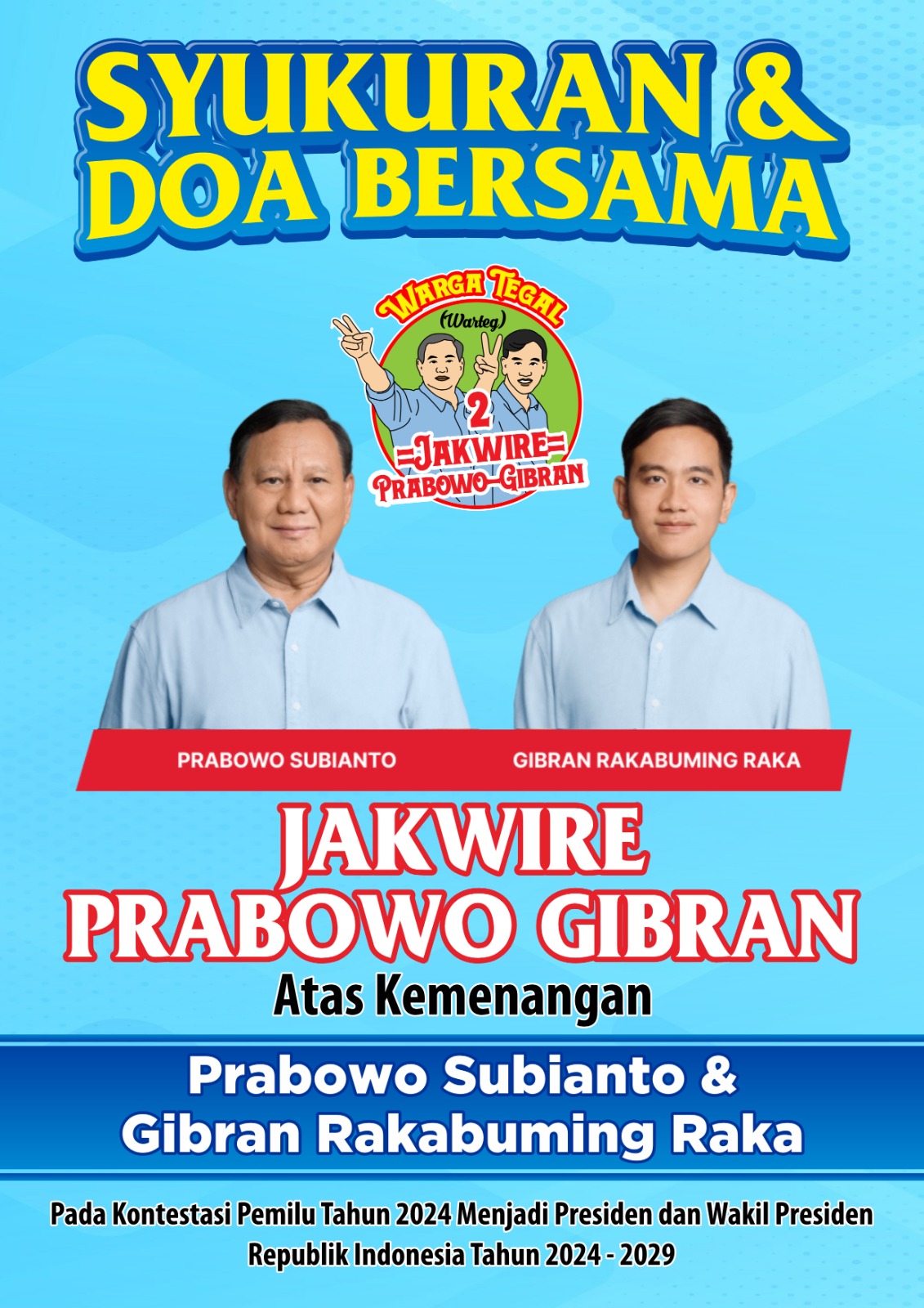 KabareTegal – Jakwire Prabowo Gibran menggelar acara syukuran dan doa bersama atas kemenangan Prabowo Subianto dan Gibran Rakabuming Raka pada kontestasi Pemilu 2024 menjadi Presiden dan Wakil Presiden RI Periode 2024-2029, di Raja Sunda Bekasi, Minggu (3/3/2024).