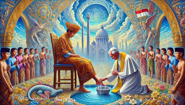 Menyambut kedatangan Paus ke Jakarta, 4 Lukisan Denny JA, dengan asisten AI, soal Paus mencuci kaki rakyat kecil Indonesia.👆👇