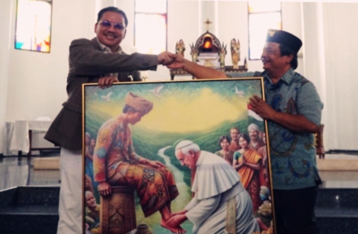 Saya pun membayangkan Paus Fransiskus mencuci kaki rakyat Indonesia. Dalam lukisan itu, ada elemen batik, bendera merah putih, juga mesjid sebagai simbol suasana Indonesia.